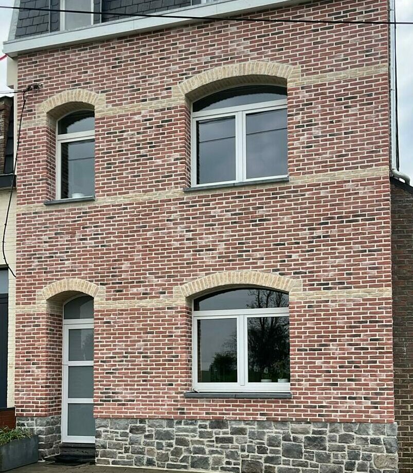 Résultat : une façade isolée en briquette rouge avec joints clairs, crépi blanc à l’arrière, soubassement en pierre moellons, finitions en aluminium et pierre bleue. Respect total de l’esthétique d’origine, même pour les courbes des fenêtres.